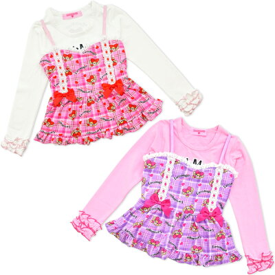 【EARTHMAGIC正規取扱店|9/7新作入荷】アースマジック 2021秋冬 ハートチェックマフィー総柄キャミソール&長袖Tシャツセット ベロア生地 プリントTシャツ 女児 女の子 子供服 キッズ トップス 100 110 120 130 140 ペールピンク ラベンダー 紫